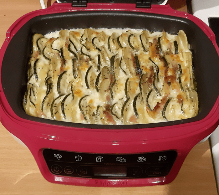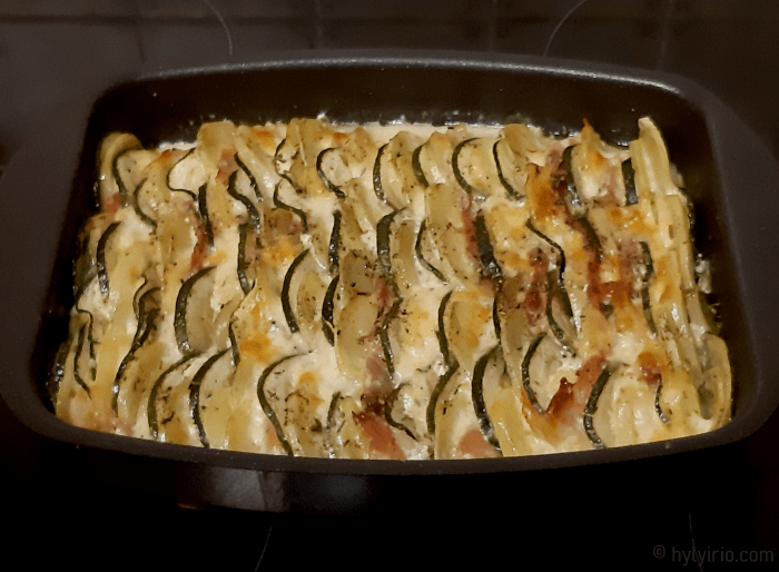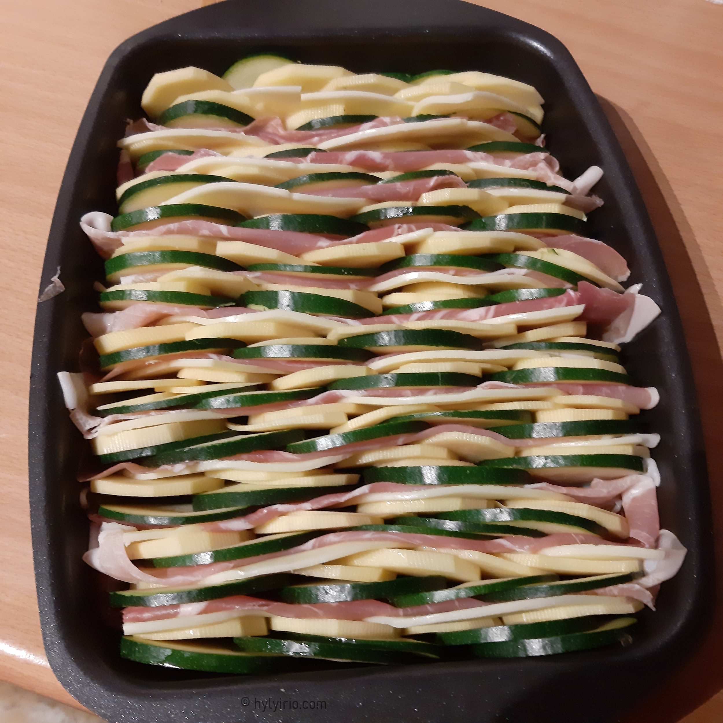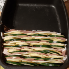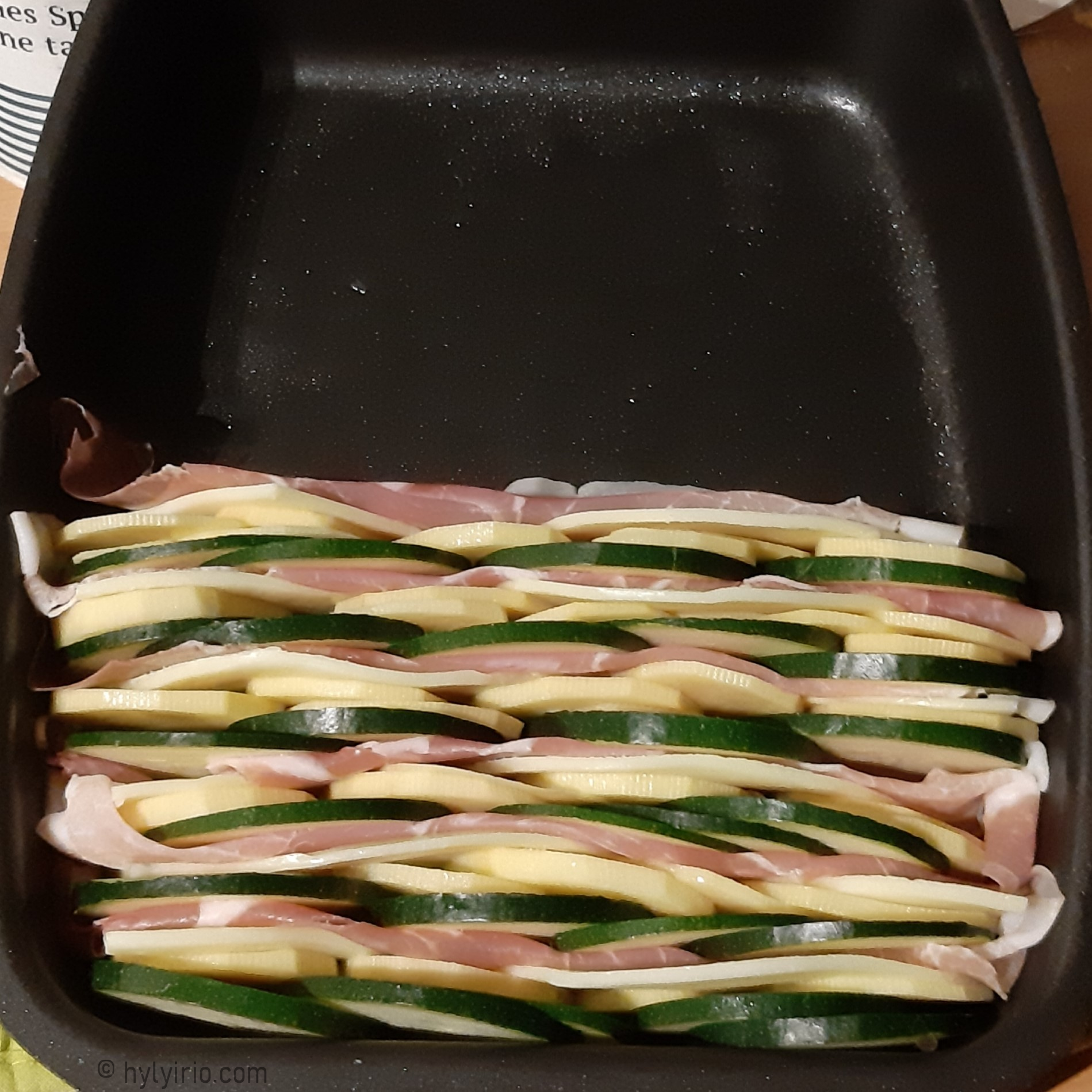 Dans votre plat, commencez à disposez les ingrédients en alternant (dans l’ordre suivant, pour ne pas que votre jambon ne s’assèche) : une rangée de pomme de terre, une rangée de courgette, une tranche de jambon, une ligne de mozarella (dans mon plat, cela faisait deux demi-tranches côte à côté). Et vous répétez la manipulation jusqu’à ne plus avoir de place et/ou d’ingrédients. N’hésitez pas, de temps en temps, à tasser/pousser vos rangées pour pouvoir en mettre plus.